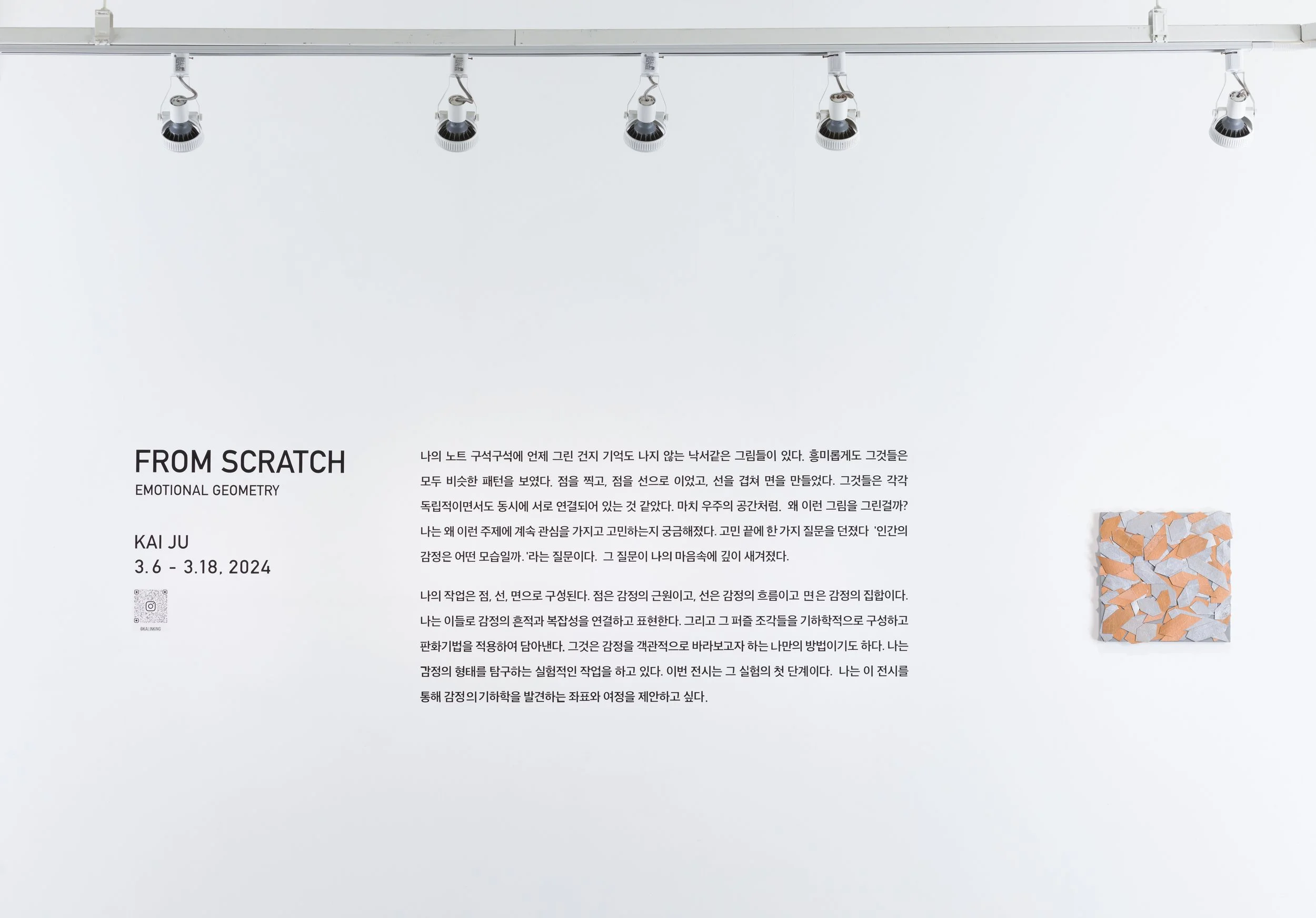 나의 작업은 점, 선, 면으로 구성된다. 점은 감정의 근원이고, 선은 감정의 흐름이고, 면은 감정의 집합이다. 나는 이들로 감정의 흔적과 복잡성을 연결하고 표현한다. 그리고 그 퍼즐 조각들을 기하학적으로 구성하고 판화기법을 적용하여 담아낸다. 그것은 감정을 객관적으로 바라보고자 하는 나만의 방법이기도 하다. 나는 감정의 형태를 탐구하는 실험적인 작업을 하고 있다. 이번 전시는 그 실험의 첫 단계이다. 나는 이 전시를 통해 감정의 기하학을 발견하는 좌표와 여정을 제안하고 싶다. <2024, 작가노트>