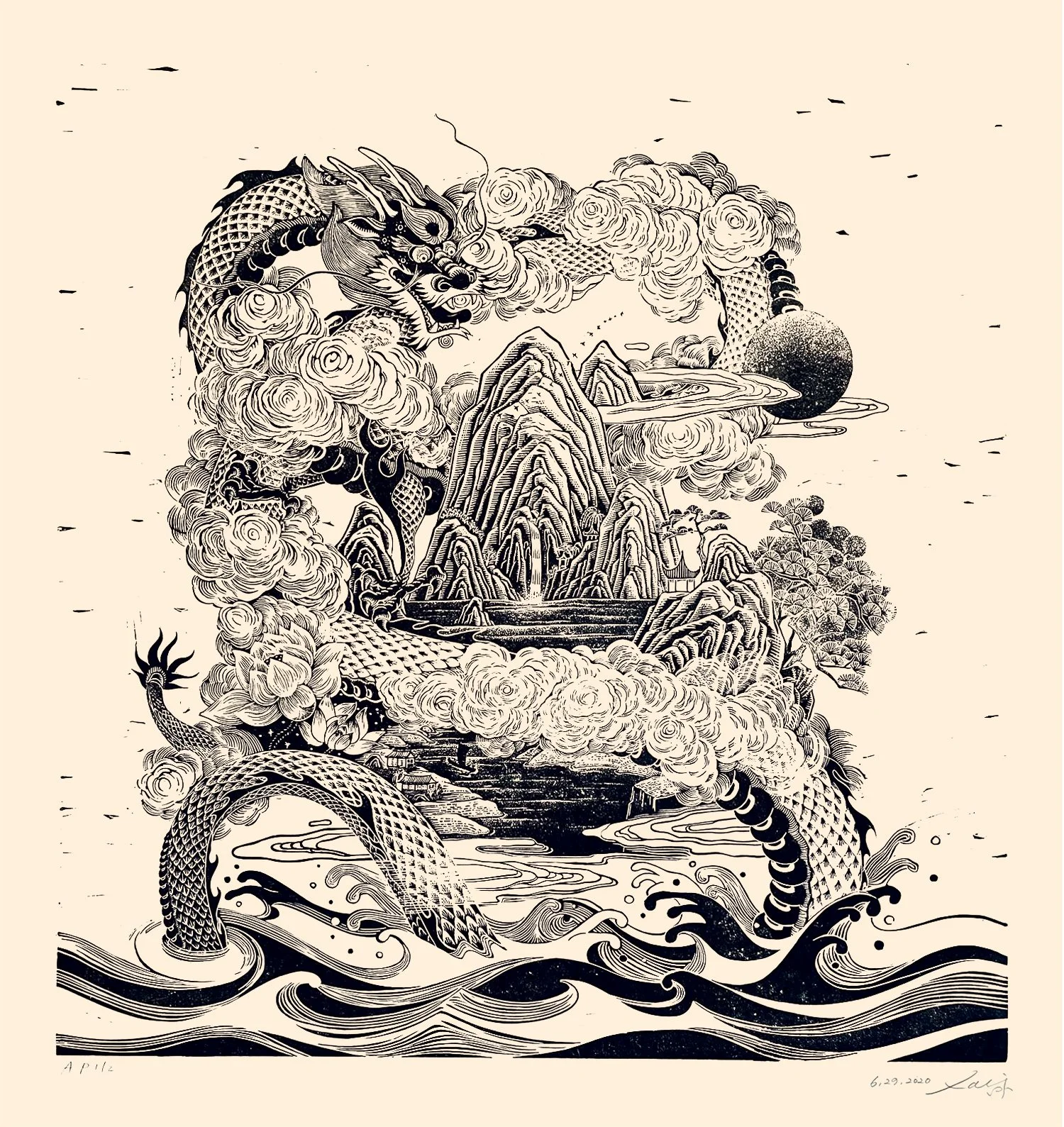 30.5x40.6cm, Linoleum, hand-printed, oil link, Kitakata paper.